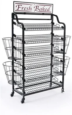 Bakery Display Rack W/ Wheels, 4 Shelves, 2 Side Baskets & Header – Black