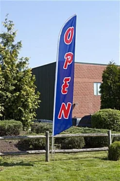 14′ Feather Flag & Ground Spike With Pre-printed OPEN Message – Blue