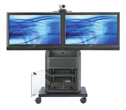TV Cart With Mounts For 2 Monitors Up To 70″, Storage Cabinet, Camera Shelf – Black