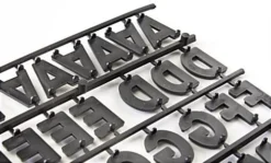 This letter kit includes six sheets, totaling 930 individual numbers, symbols and ABCs. The plastic characters insert into a grooved or track-style menu display, such as the MNULTBDLG. The letter kit, also known as changeable inserts, features tabbed backing to easily clip each unit into a board. This business sign set is made from black, injection molded plastic, contrasting perfectly against white letterboards. This letter kit has inserts measuring 1″ tall to fit most menu displays and boards. The changeable sign set gives users the ability to quickly update a bulletin by simply adding or removing characters. The letter kit is therefore perfect for use within restaurants, business lobbies, offices, schools and hotels requiring up-to-date messages and bulletins.