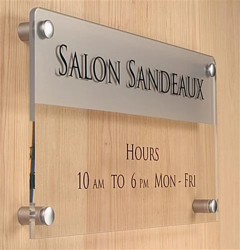 To install this wall mount display, first mount the standoffs using the included mounting hardware. Drill 1/2″ holes in your sign panel and place the standoff caps through the holes and into the standoffs mounted on the wall. Tighten the standoffs together and walk away to admire your effort!