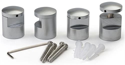 These standoff systems include an allen wrench that makes it easy to torque your standoffs tight. Sign standoffs, signage hardware, and other standoff systems are shipped with easy to read instructions that make mounting your display on the wall quick and simple. To mount your retail standoffs, mark on your wall where you want them to go, and screw each sign display into the wall using the provided hardware. These standoff systems can then have your sign panel set into place, and you can screw the endcaps on to finish your display.