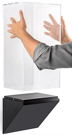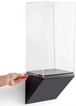 Whether for public display or use in a private collection, this museum pedestal wedge wall case features a sturdy design and beautiful, modern look to complement any space. The 10” wide exhibit shelf can support up to 55 lbs, making this ideal for large bowls, sculptures, and other heavier collectibles. With a modern tapered base and 18” tall rectangular acrylic vitrine, the black pedestal wedge wall case is easy to mount and offers a frameless view of stored treasures to enhance art galleries, libraries, or retail storefronts. Simply install the provided hardware on a flat surface and hang the MDF shelf using the recessed brackets, complete with an optional felt strip to prevent scratches and keep the unit flush. To display dolls, bowls, or sports memorabilia, simply lift off the acrylic vitrine, then mount on the base and screw in place along the sides of the rectangular enclosure to prevent tampering, an essential feature for retail stores, art galleries, and other public locations. Ideal for use in the home as part of a private collection or a commercial exhibit, this wedge wall case emulates the design of artifact-quality shadow boxes at an affordable price point.