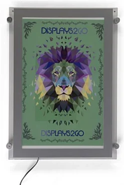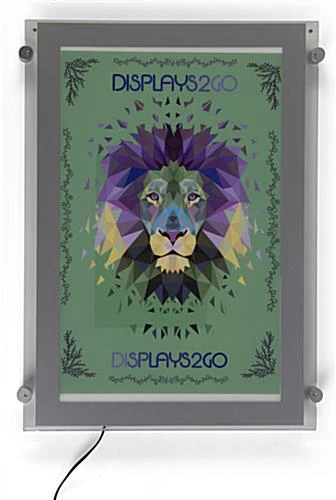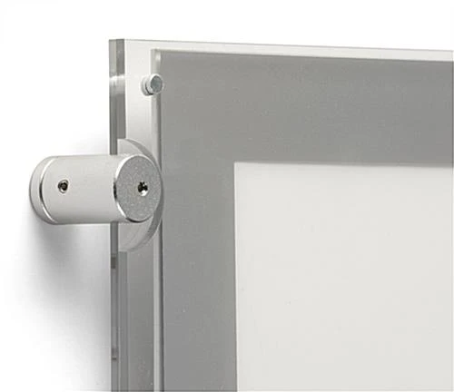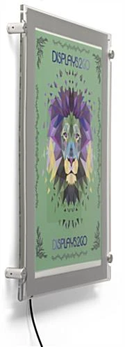 This LED edge-lit frame can draw attention to your advertisement from across a hotel lobby or give your artwork at home that modern look. The microscopic lights under the silver frame are evenly distributed and bounce off the back panel to give translucent posters a leveled illumination surface. This energy efficient edge-lit frame was designed for 11” x 17” graphics that slide into an acrylic overlay and hang on 4 silver edge-grip standoffs. The super button magnets at the top of the panel allow you to slip in new artwork with ease and keep your posters in place with the hinged bottom. Mounted light boxes such as these are ideal for art work displays, business logos or signs for a dance troupe coming to your theater. This edge-lit frame is easily mounted on the wall with the included standoffs and installation hardware. Due to the diode lights, it is long lasting and energy efficient with an illumination averaging 3,000+ LUX.