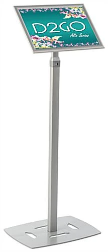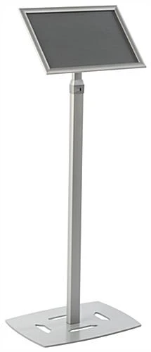 This silver 11 x 17 poster frame pedestal is the perfect way to catch the attention of passersby! Featuring height adjustability between 53”h x 72”h, the floor stand sign holder can showcase products on sale or other flashy advertisements at the ideal height for your location. The aluminum pedestal is built with sturdy construction for years of use. The simple to use sign holder snaps open on each side for easy access to the images or menus to be changed. A pedestal such as the one shown here is a great floor stand fixture for car dealerships, movie theaters, restaurants and many more types of establishments. Each display comes with a sturdy weighted base to keep the unit upright while in use.