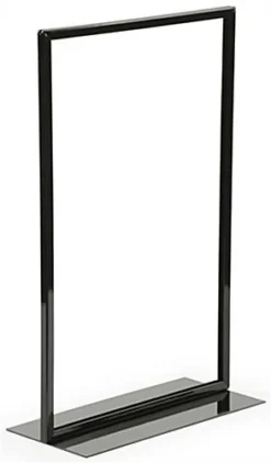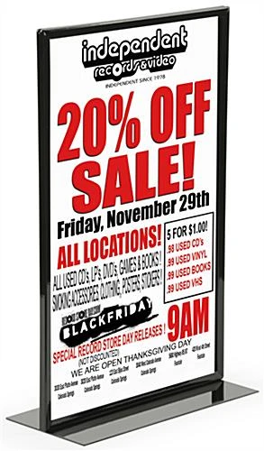 This vertical 11 x 17 sign holder is constructed from steel and has a black powder coated finish to match any décor. The frame is top-loading and double-sided to gain maximum exposure for signage. The weighted base makes this sign holder perfect for retail merchandising displays. Place the frame on shelves or within product displays to give more information about sales, promotions or product details. The sign holder is also great for trade shows and conventions to showcase company information. These frames can be purchased in bulk for additional savings!