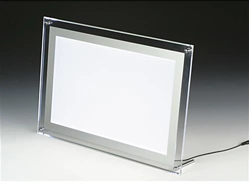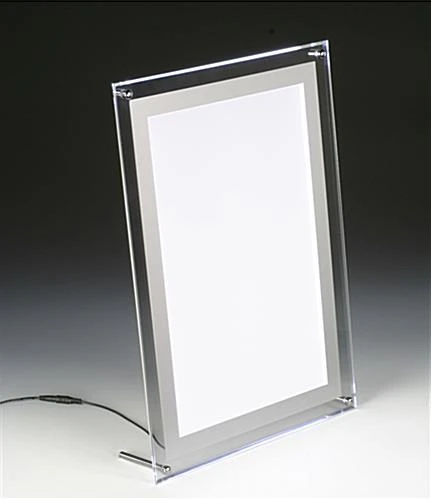 An acrylic slim lightbox, also known as an ultra-thin illuminated sign holder, is very easy to use. To load pictures, simply unscrew the 4 sets of metal plated binding screws located in each corner. Slide your print between its 2 acrylic panels into the slim lightbox with screws. Your image will appear to float inside the inner silver frame of the edgelit light panel. Fastened together, the slim lightbox that illuminates advertisements measures only 0.35″ thick! An ultra thin illuminated picture frame can be wall-mounted using 4 small screws and a Phillips head screwdriver (not included) or placed on a countertop using 2 longer binding screws. Extra hardware is included with each slim lightbox that attaches to walls. By simply amending its supporting screws, you can easily change images to be shown in the LED illuminated signs to either a vertical or horizontal presentation. Plug in its power adapter to illuminate and watch as this super slim lightbox that changes position catches the eye of every passerby!