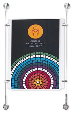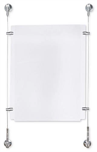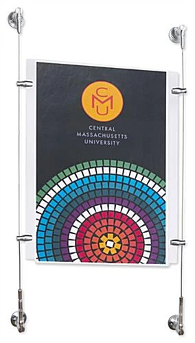 This wall mount poster holder, also known as cable displays, is perfect for businesses looking for relatively low cost signage that grabs the attention of the customer. This kit includes custom designed satin silver finished hardware for an elegant look to blend well with any environment. This suspended signage kit, wall mount poster holder includes a crystal clear acrylic panel with a simple to use top-insert design. Users can quickly switch out marketing materials according to business needs. This wall mount poster holder is part of a large selection of cable kits in all different sizes and configurations. Purchasers can choose a pre-designed set or create a unique matrix by combining multiple different kits.