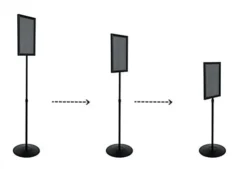 These sign displays are perfect for displaying advertisements in a retail store. The sign displays, also known as poster frames, hold standard, 11″ x 17″ graphics, printable right off most business printers. The sign displays have a sturdy, 1/4″ thick black expanded PVC backer, so regular weight printer paper can be used; thicker poster material is not needed. Another option is to bring the backer to your local sign shop to have it silk-screened with a custom message. The sign displays feature a 1″ diameter telescoping pole so your signs can stand anywhere between 45-1/2″ and 69″ high. Between the economical cost and versatility offered, these sign displays are a perfect choice for businesses looking to cut costs, stay within a budget, or order a large quantity of units.
