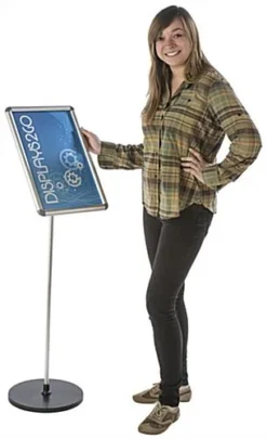 This 11 x 17 silver snap frame stand is a front loading poster holder. Display each sign display in lobbies, stores, and tradeshows to promote merchandise and services. Weighing only 6 lbs., relocating the aluminum snap frame stand as desired for product placement advertising is made effortless. The front loading design makes it easy to rotate and switch out a poster for different promotions. Equipped with an aluminum snap frame enclosure, this stand is fixed in a portrait orientation. Alternatively, tilt the holder 180° up or down for an ideal viewing angle by simply pushing the adjusting button located on the mount.