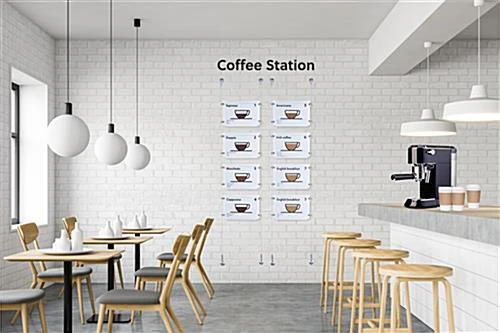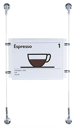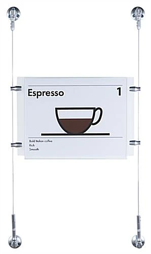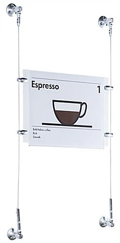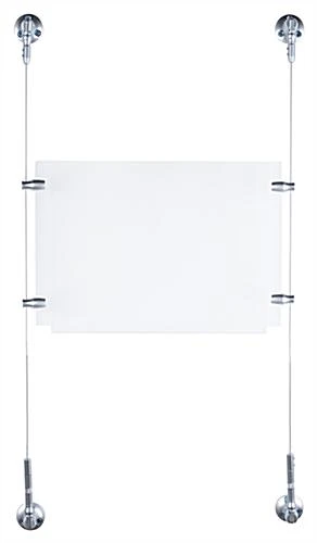 This hanging sign, also known as cable displays, is perfect for businesses looking for relatively low cost signage that grabs the attention of the customer. This kit includes custom designed satin silver finished hardware for an elegant look to blend well with any environment. This suspended signage kit, hanging sign includes a crystal clear acrylic panel with a simple to use top-insert design. Users can quickly switch out marketing materials according to business needs. This hanging sign is part of a large of selection cable kits in all different sizes and configurations. Purchasers can choose a pre-designed set or create a unique matrix by combining multiple different kits.