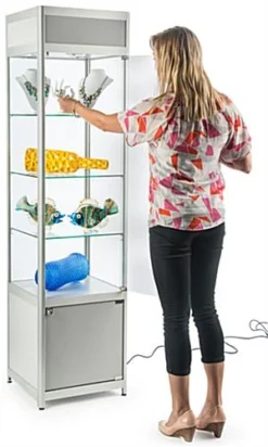 This light up retail tower is a beautifully designed display case that’s ideal for any business. The glass cabinet with LED lighting gives you an eco-friendly accessory when turned on. The silver retail tower also includes 3 adjustable shelves which is great for adapting to merchandise that’s larger in size. There are two key locks on the display case that are used for showcasing and storage to keep your products safe and out of sight. This retail tower ships unassembled to save on shipping costs and can be put together with a second helper. Give your business a quick upgrade with this beautiful accessory with LED lighting!