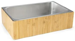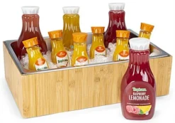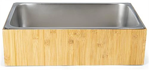 Create an eye-catching beverage display with this ice pan with bamboo housing. This stylish serving unit is great for hotels, restaurants, and cafeterias when a chilling solution is needed for breakfast bars or buffets. With an overall size of 21” x 13” and bin depth of 5.5”, this ice pan with bamboo housing and removable stainless steel tray has ample room for all of your favorite drink or food items. With its open-top design, this serving chest makes an attractive beverage display while allowing your guests to make quick selections to prevent congestion and keeps lines moving. The removable stainless steel pan makes filling and cleaning up a simple task. Chill beverages or snacks at your next catering event or buffet with this stylish and versatile ice pan.