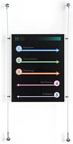 These wall mount poster systems, also known as cable displays, are perfect for businesses looking for relatively low cost signage that grabs the attention of the customer. This kit includes custom designed satin silver finished hardware for an elegant look to blend well with any environment. These suspended signage kits, wall mount poster systems include a crystal clear acrylic panel with a simple to use top-insert design. Users can quickly switch out marketing materials according to business needs. These wall mount poster systems are part of a large selection of cable kits in all different sizes and configurations. Purchasers can choose a pre-designed set or create a unique matrix by combining multiple different kits.