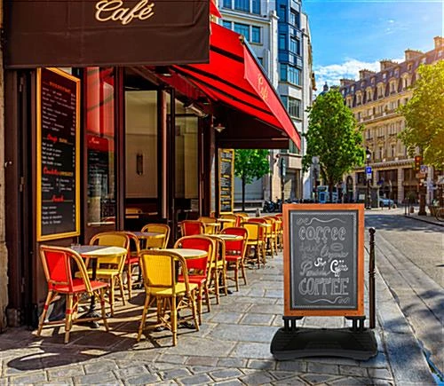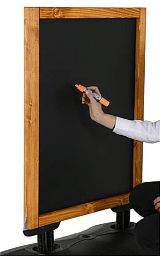Our magnetic chalkboard sign features a rustic fir wood frame, making for a sleek, modern sidewalk advertising display. This double-sided WindPro signage has a convenient water-filled base that can hold up to 6.34 gallons, making for a sturdy fixture that can withstand heavy winds and inclement weather conditions. Each rustic magnetic chalkboard sign has built-in wheels for added convenience, allowing you to move your sign inside with ease at the end of each business day. This double-sided sidewalk display is compatible with liquid chalk markers. Our 24″ W x 30″ H outdoor signage is perfect for displaying promotions, sales, specials, and more outside of your boutique, cafΓ©, brewery, or salon, helping grab customer’s attention from the roadside. This Windpro magnetic chalkboard sign has a durable and long-lasting design that will enhance your business’s advertising efforts for years to come!