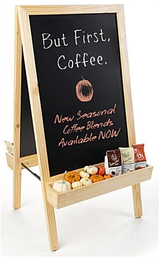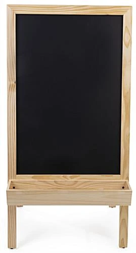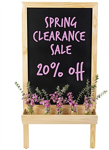 With the double-sided 24”w x 36”h write-on message boards, you will easily attract the attention of passersby walking or driving from either direction. This A-frame chalkboard sidewalk sign serves as the perfect menu board in a commercial or food service environment. The double-sided plant-holders featured at the bottom of the display also serve as the perfect merchandising opportunity when you fill them with your favorite quick sale items. This A-frame menu board is made of sturdy wood with a natural finish, folds up for convenient storage, and can be used either indoors or outdoors. Get creative with your chalkboard sidewalk sign with planter bottom and start grabbing the attention of roadside and pedestrian traffic.