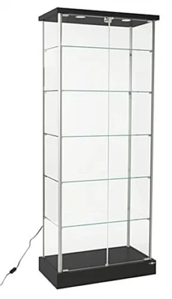 This retail glass display case features (2) recessed LED lights to illuminate a selection of high priced items, such as fine jewelry, artwork, sculptures, and collectibles. Provide convenience for customers viewing products and ease of mind for employees distracted by other tasks with these locking trophy cabinets. Design custom arrangements with more versatility and style than store fixtures like slatwall units with a wide display case. Taller items can be easily positioned within the showcases by modifying or removing one of the five height adjustable shelves. Trophy store fixtures with double locking hinged doors provide easy access to merchandise for employees making a sale. Cabinets with down lighting provide a simple and traditional eye catching display case that is ideal for any boutique, specialty shop, or studio.