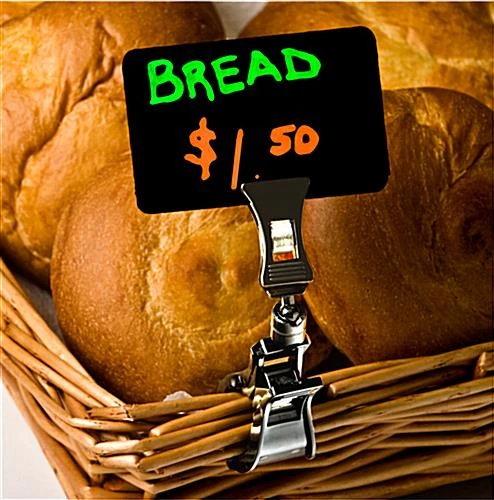 Each message display is a sign clip that is black with a glossy finish. These deli tags are made to be used with liquid chalk and wet-erase markers [Sold Separately].This sign clip is a creative option for businesses wanting to promote items with a display that will stand out even in busy settings. Neon colored pens make a nice bright presentation against the black unit. This sign clip, also referred to as a free sample board, is double-sided to possibly attract customers from multiple locations. These holders have a ball joint, which allows them to be angled and tilted for better viewing by consumers. Each display for a free sample is a sign clip that can go vertically or horizontally to accommodate various advertising designs. These holders will easily attach to any basket display for promoting free samples or products in a bin. Each write-on deli tag is a sign clip that will remain in place because they are designed with a non-slip coating on the bottom clamps. A display such as these wet-erase boards are most often found in retail stores, restaurants, and reception halls. This double-sided sign clip is easy to clean using a damp cloth. Like most wet-erase boards, these holders will also look new when washed.