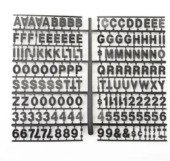 These sign letters attach to grooved message boards such as the MNULTBDSM menu display. The black characters are easiest to view when used on top of a white background. These sign letters, also known as replacement menu board inserts, include tabs to easily insert your characters into letterboard channels. The changeable numerals include 6 sheets of numbers, symbols and all of the ABCs. The set includes 900 characters! These sign letters can be used on a variety of menu boards and message displays. The tabbed characters kit has more vowels and primary consonants. (Please view the PDF document linked below for actual counts.) These sign letters are made from injection molded plastic.