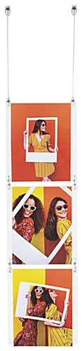 This cable display, ceiling hanging sign comes with custom designed satin silver hardware that adds elegance to business advertising. The nylon coated stainless steel wire does not fray when cutting to size and comes with an ample length for even the tallest ceilings. This ceiling hanging sign is stylish and sleek to fit into any business! The panel grippers securely hold signage in place. This ceiling hanging sign allows users to switch out graphics quickly and simply with the top-insert acrylic panels. This display is a contemporary solution to visual merchandising. This ceiling hanging sign is convenient for businesses who want to replace bulky, outdated advertising signage.