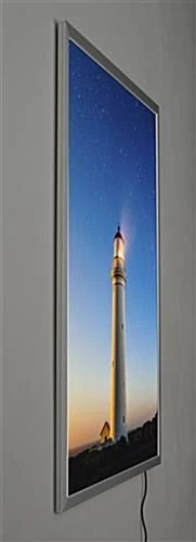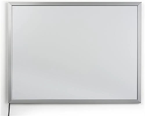 This silver 30″ x 40″ lighted frame makes drawing attention to your advertisements, movie poster or gallery pieces a snap. It can be mounted vertically or horizontally with the included brackets and screws for an overall simple setup process. This sleek lighted frame has a front loading design to center graphics easily and do so without taking it off the wall. It has LED bulbs around the edge that bounce across the acrylic back panel, making every inch of your graphics surrounded in luminescence. The diode bulb technology is energy efficient and will last up to a decade for a long lasting display fixture. This lighted frame has an overall modern style that can complement classic movie posters, retro advertisements or landscape photographs. The simple design makes for an easy wall mounted fixture that will draw attention to your graphics bathed in LED illumination.