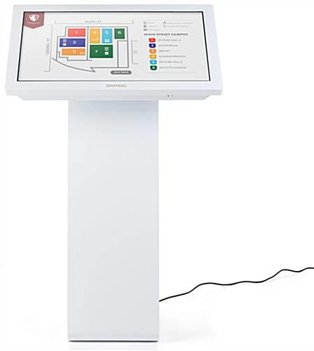 Deliver dynamic messaging with this white touch screen monitor kiosk that features a multi-touch 10pt IR 32” panel and 1080p resolution for sharp images and text. Upload content to this slanted digital signage unit with the plug-n-play design using the available USB port or via a personal cloud storage account over WiFi. This white capacitive touch screen monitor kiosk display offers an interactive solution that promotes customer engagement and is perfect as a wayfinding directory on a campus, menu board in a restaurant, building directory or lobby display. The large scale 32” WLED monitor features a 1400:1 contrast radio, 450-nits brightness, and 89/89 viewing angle. This display unit also features an Android operating system, 2GB of RAM, and 8GB of internal storage for ease of marketing content loading and maintenance. Enhance your multimedia content with this WiFi device that functions with a simple touch of your finger, making it the ideal digital signage advertising fixture. When paired with properly developed content, this touch screen monitor kiosk can provide your establishment with an interactive display to enhance your customers’ experience.