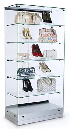 These display cases measure 36″ wide and have (5) shelves that rest on rubber-padded clips to prevent the glass ledges from any unwarranted movement. These store fixtures have sliding rear doors, which is valuable to businesses that need to change out products or exhibited items quickly! These showcase cabinets, display cases that have adjustable shelves, can be modified to accommodate different size products. This feature is significant when housing larger items like autographed baseball bats, sculptures, large acrylic shadow boxes and other treasured artifacts. These glass cabinets, display cases that hold figurines, collectibles and accessories have a brilliant silver finish! The painted finish blends seamlessly into any environment and provides an added level of sophistication to any exhibition space!