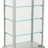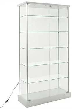 This glass display cabinet provides an alternative store fixture in the form of a contemporary curio case. Design a custom retail arrangement on the (5) height adjustable and removable shelves. High quality items are safely locked behind (2) swing open doors within this free standing display cabinet. Showcases are an ideal alternative for corner cases or sample tables as the retail merchandise can be exhibited elegantly for customers to view while remaining cautiously behind panels preventing tampering or damaging. Additionally, the double hinged doors provide easy access to products arranged inside while stocking the shelves and making a sale. High quality showcases, also known as trophy cases, create an impact with (2) LED recessed lighting fixtures located in silver veneer canopy top. Concealed beneath the base are (4) casters, providing portability to the display cabinet. No matter the merchandise locked within a floor standing case, the simplistic design of the EuroVū series will complement it well.