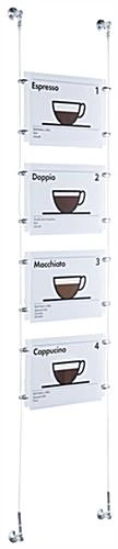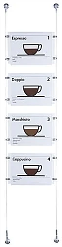 This picture hanging system, also known as cable displays, is perfect for businesses looking for relatively low cost signage that grabs the attention of the customer. This kit includes custom designed satin silver finished hardware for an elegant look to blend well with any environment. This suspended signage kit, picture hanging system includes a crystal clear acrylic panel with a simple to use top-insert design. Users can quickly switch out marketing materials according to business needs. This picture hanging system is part of a large of selection cable kits in all different sizes and configurations. Purchasers can choose a pre-designed set or create a unique matrix by combining multiple different kits.