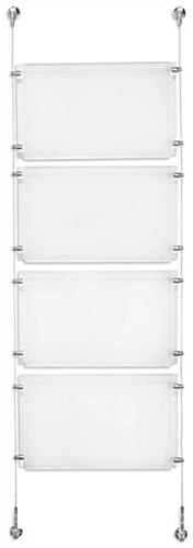 This cable suspension system, also known as cable displays, is perfect for businesses looking for relatively low cost signage that grabs the attention of the customer. This kit includes custom designed satin silver finished hardware for an elegant look to blend well with any environment. This suspended signage kit, cable suspension system includes a crystal clear acrylic panel with a simple to use top-insert design. Users can quickly switch out marketing materials according to business needs. This cable suspension system is part of a large selection of cable kits in all different sizes and configurations. Purchasers can choose a pre-designed set or create a unique matrix by combining multiple different kits.