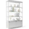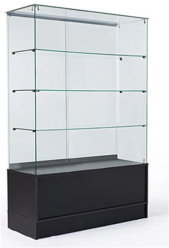 We use shatter-resistant tempered glass in the construction of our display cases, which will break into rounded pieces if an accident does occur. Small metal connectors hold the glass panels and shelving together, removing the chance of obstructing product views. This model features sliding doors with a lock and key system as well as bottom loading storage cabinets. Each glass showcase ships unassembled, saving customers money on shipping cost. Assembly is quick and simple. Typically two adults can unpack, build, and make this display ready for the sales floor in 25 minutes or less.