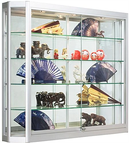Utilize this wall mounted LED showcase as an efficient yet effective way to bring your products into the limelight. Three adjustable ceiling spotlights paired with tempered glass shelves and a mirror back work together to illuminate merchandise on display and grab the attention of passersby. Each contemporary LED showcase features angled sides for a sleek look that brings focus to the front of the unit. The 4 tempered glass shelves rest on adjustable rubber-padded clips that allow users to change the display to hold various sized products. Protect your electronics, collectables, and other memorabilia in the cabinet with the included plunger lock. With efficient ceiling spotlights, durable tempered glass, and pre-assembly, this LED showcase is the perfect fixture for any company!