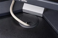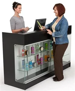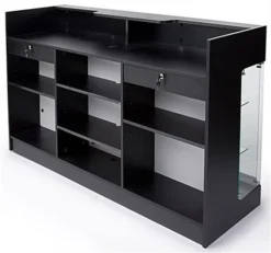 This retail store counter features the best of both worlds, incorporating a sizeable countertop area with a front showcase for displaying your merchandise. The top features a deep well for placing up to two cash registers. All glass is tempered for safety and the front sliding doors are also lockable. Inside the black retail store counter are two glass shelves that are fully adjustable to accommodate various sized items. On the rear side there are two locking drawers and a sizeable amount of storage space for replacement stock and other supplies. The store counter ships flat for customer assembly.