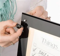 These graphic holders feature an acrylic frame that can hold an 8-1/2″ x 11″ print. The poster is held between two pieces of acrylic secured by (4) screws with decorative caps. To insert signage; unscrew the (2) top caps and slide the sign in between the panels, replacing the caps to finish. These sign displays, graphic holders can be displayed either horizontally or vertically. This versatile poster stand gives users a lot of freedom to create signage in either portrait or landscape orientation. Lobby stands, poster displays, and other graphic holders have an adjustable bracket that allows users to angle the frame however desired. Simply turn the dial located behind the frame to make adjustments. These sign stands are perfect graphic holders for use in restaurants, retail stores, and business or hotel lobbies. The black metal finish stands out in any type of business setting.
