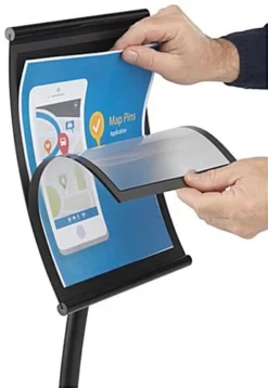 This sign display is great as a trade show accessory or as a lobby stand! This unit has a unique curved design. This sign display is 52″ tall and the frame is 9.5″ wide by 14″ high. Banks, hotels and other businesses use this poster stand to advertise in their lobbies. Each sign display features a curved pole that attaches to the weighted base on one end, and the concave picture frame on the other end. The tall, slim construction makes it an ideal option for placement in most any busy hallway or entryway. Each sign display features a weighted base. The weight of the base keeps the unit upright, and helps to counteract the effects of incidental bumping or tipping.