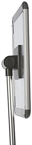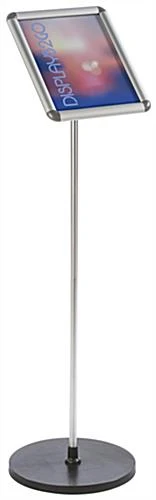 This 8.5 x 11 silver snap frame stand is a front loading display for posters and signs. Help promote products and services in lobbies, stores, and trade shows with this pedestal style fixture. This poster snap frame stand is fixed in a vertical orientation. Adjust the viewing angle by pressing the button on the mount and locking in place when the sign is tilted at a desired position. The weighted base prevents the snap frame stand from tipping over; while the aluminum construction keeps it light enough to easily move around a store. Effortlessly rotate between graphics for every season and event with this front loading advertising display.