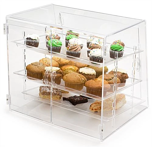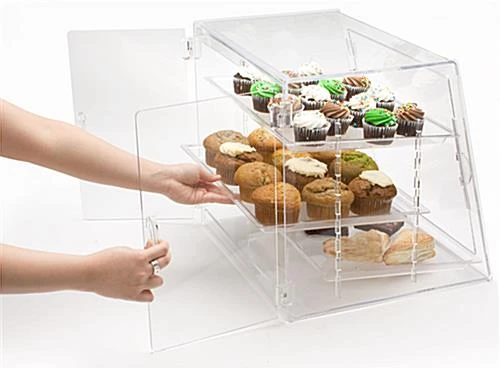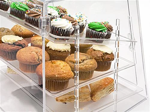 This food storage bin, food display has a stylish design that can be used in any environment. This food display is ideal for use on any countertop or tabletop surface. A food display, like acrylic bins and food storage containers, is made from clear acrylic. The clear design of this food display makes it easy for customers to view the contents. This food display also has a front door and two rear doors for easy access to the contents. The front door allows customers to easily select food items, while the rear doors allow clerks to add new pastries from the back. We supply this food display with 3 removable trays for added convenience.