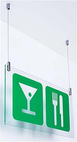 The individual components are machined from stainless steel and finished off with chrome plating. This cable hanging kit that displays way-finding signage installs simply yet quickly. The sign clamp holds your sign panels (up to 1/4″ thick) securely with the aid of set screws. Suspension is achieved with the wire leading up to the ceiling mounts, providing a clean overall appearance certain to accent any interior. The high-strength nylon-coated wire and beautifully machined steel components combine to create an upscale mounting system for your interior environment. Buy this cable hanging kit that’s designed for professional applications for all your overhead signage requirements!