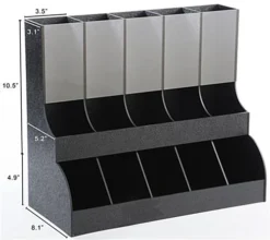This coffee station organizer has (10) compartments that can accommodate everything from drink supplies to condiments. The top tier includes a transparent acrylic front piece for a unique visual effect. Each countertop organizer includes space for straws, cups and condiments such as single-serve creamers, sugar packets, and more. The holder is crafted from textured ABS plastic and features a black finish. Designed for countertop storage, the organizer is a great way to offer a variety of beverage supplies all in one place. Many restaurants also use the holder in kitchens to keep condiments organized and accessible. A countertop storage display is an ideal way to keep beverage areas looking neat and professional!