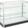 This countertop glass display case is a great way to show products in a retail setting. Featuring a wooden base and top with a black melamine finish, this fixture looks professional and eye-catching in any commercial environment. The tempered panels, door, and shelves of the retail display case provide a material which is stronger and more aesthetically pleasing than plastic. Feet levelers fixed to the bottom of this commercial fixture stabilize the cabinet on store tabletops that may be uneven. A locking hinged door on the display case keeps contents safe so retailers can show products and feel secure. The shelving in this cabinet cannot be adjusted, but there is adequate spacing for collections varying in height.
