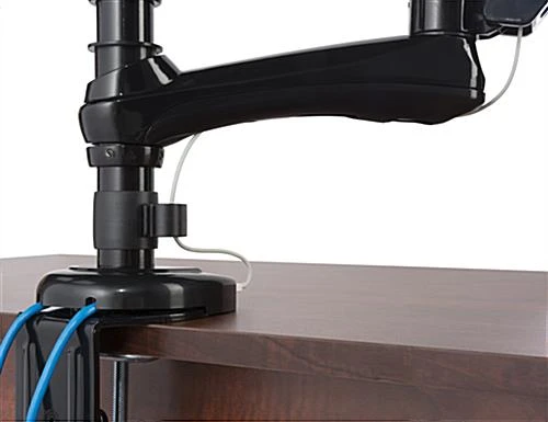 Create a clean and organized computer work space in your home or office with this desk mount dual monitor arm. Each height adjustable stand can move up and down using either the pole fasteners or the gas spring supports. Furthermore, each flexible desk monitor arm can tilt, pan, and rotate to give you endless possible setup configurations. Attach the adjustable stand to your tabletop with the included grommet or clamp fasteners. A built in USB 3.0 hub offers 2 ports for quick access without having to dig around in the back of your computer. The tray attaches to the bracket of your choosing in seconds using the included hardware, then simply place your notebook atop and you’re ready to go! Grab a desk monitor arm for your home or office today and start taking back your cluttered or unused counter space!
