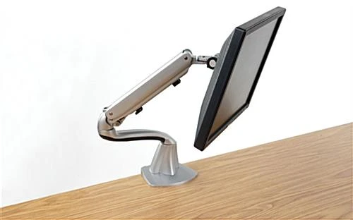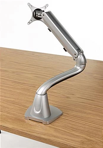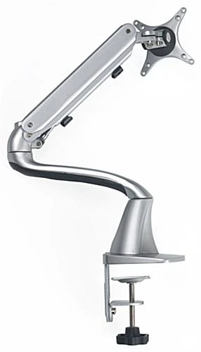 This gas spring desk monitor mount, also known as an LCD table stand, is constructed of durable aluminum. The built-in tension gauge assists in moving the computer or flat screen. Each silver desk monitor mount is sleek and saves space on the table surface. This LCD display allows users to adjust the screen to the most comfortable viewing level. The flat screen stand shown here comes with mounting hardware, but the customer is responsible if the monitor requires special screws. This gas spring arm assists in reducing clutter on any table top. The clamp method is ideal for those who do not want to alter the counter by drilling a hole. These flat screen holders are durable and designed to last.