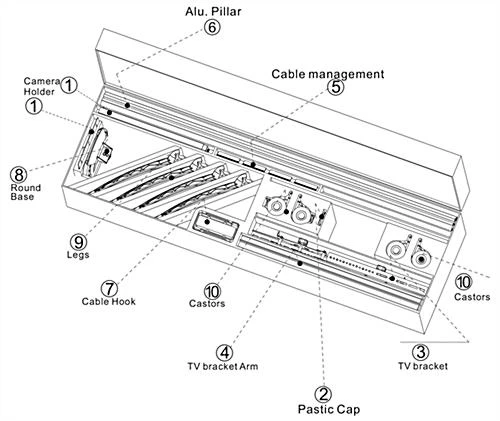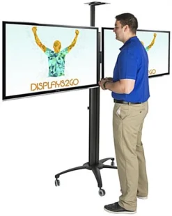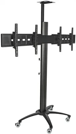 With durable wheels that lock, this industrial TV stand with case makes an ideal media cart for trade shows and other venues. Integrated cable management coupled with a cord winder and electrical supply make this modern design look professional at all times. Able to hold (2) 30” to 60” screens, each dual TV stand is perfect for gathering attention in any bustling environment. The included media cart container features padded EVA foam with a space contoured to fit each part of the television holder. Maintain peace of mind knowing your TV stand is safe from prying hands by installing a padlock on one of the 4 receptive latches. With a modern design and stylish black finish this portable setup is sure to get your message noticed.