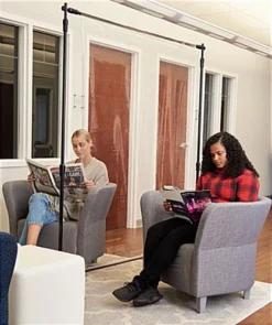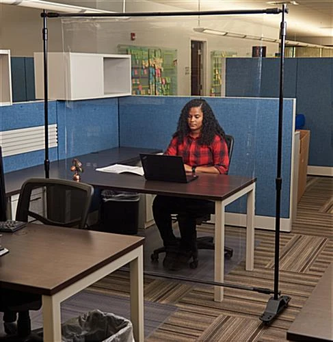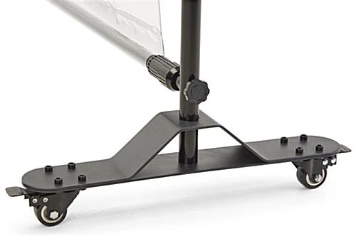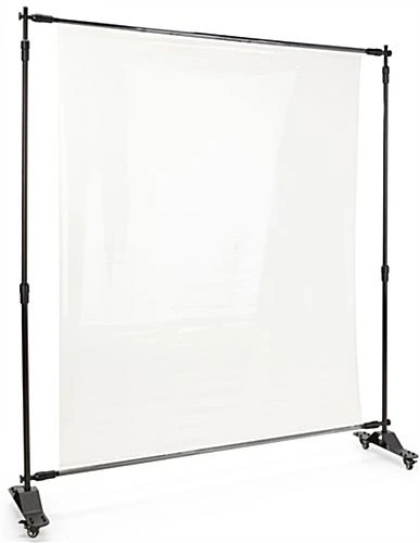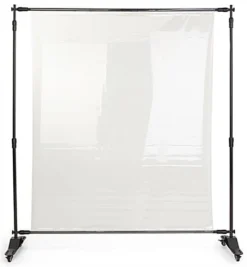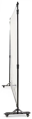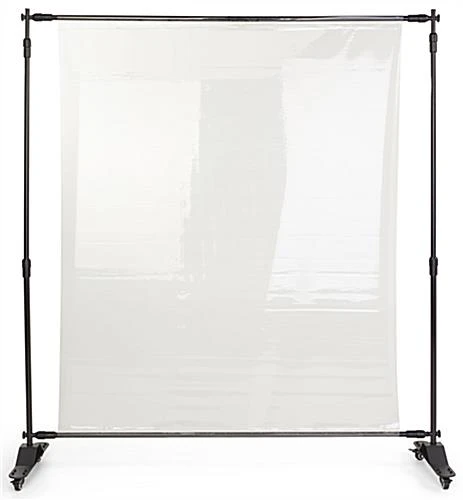This clear room divider features a 4.6 ft x 6 ft tear-resistant PVC screen and an adjustable aluminum frame offering versatility in end-use from hightops and waiting rooms to classrooms and exhibit booths. The sneeze guard’s four directional wheels with locks allow this unit to be maneuvered with ease throughout your office space. Our portable clear room divider offers stability and longevity with a black oxide aluminum frame and a durable banner substrate. The transparent PVC screen makes for easy conversation between co-workers, patients and doctors, students and teachers, and more. Easily transport this unit to your next event with the convenient knock-down design and carrying case. Our clear room divider with wheels will be the perfect sneeze guard solution for offices, nail salons, beauty parlors, exhibit booths, and more!