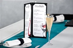 The synthetic leatherette material of these holders provides the appearance of authentic leather at a fraction of the cost. Each of these wine list covers that are black will match the decor of any restaurant. The slimmer design of this menu covering is ideal for drink specials. These wine list covers that are sturdy can stand alone on tables and countertops to catch the eye of patrons. The slim design of these drink menu is ideal for display on bar tops as well. These black wine list covers hold (2) custom printed menu cards. Easily reprint new menus as restaurant selections change, with this convenient paper size. These wine list covers that are 4-1/4″ x 11″ will improve drink sales within any dining facility!