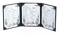 These menu holders for restaurants are a presentable way to showcase food and beverage listings. A First impression plays an important role to patrons. These card displays, leatherette menu holders for restaurants have three panels to hold 8-1/2” x 11” food and beverage listings. Each unit is built-in with album style diploma corner tabs on 4 edges. These menu holders for restaurants that have interior corners helps prevent the menus from coming loos at the edges. Each piece is durably constructed to prevent the cover from fraying. These trifold menu holders for restaurants, also known as card displays are made from fake leather to replicate genuine cowhide leather with a hard board. The elegant black matte leatherette design adds style to any fine dining establishment. Menu holders for restaurants that are built with a hard back will not bend or warp. Guests will certainly appreciate a listing that is easy to read and not torn or wrinkled.