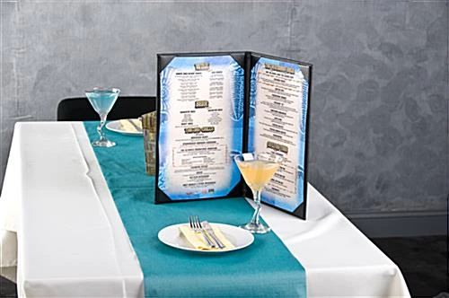 These restaurant list holders are designed for presenting 8-1/2″ x 14″, single sheets of paper, providing plenty of space to list large menus. Each menu book that folds flat can easily be stored underneath a bar or hostess station. The durable design of each specials holder provides an upscale appearance. This restaurant menu book is sturdy enough to stand on it’s own, ideal for placement in the center of dining tables. Present entrees, desserts, or wine lists! This menu book has a bi-fold design, making it easy to read and handle. The two-page book style is simplistic, yet elegant. This (2) page menu book is a great accessory to pair with table tents and place card holders as well!