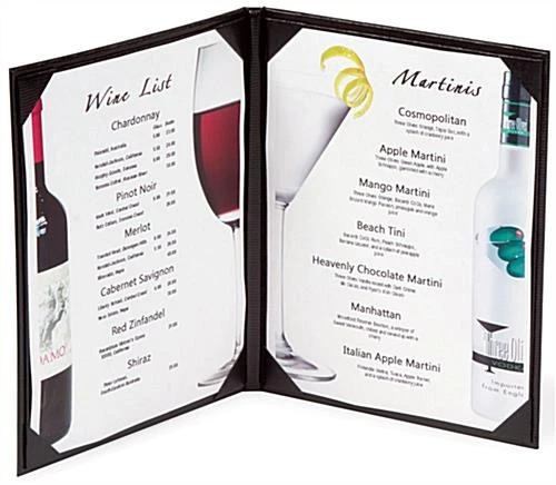 This menu holder, also known as a food listing cover, is a sophisticated way to present your dining options to patrons! The bi-fold, book-like design makes it easy for patrons to hold while making a selection. This menu covering, menu holder is ideal for quick changes and frequent revisions to food and drink options. Each of the corners features a tab to slide the paper underneath. Seen in all kinds of dining establishments, this menu holder is popular in bistros, cafes, and any bar with an extensive wine selection. Restaurants often use this protector to present a separate dessert menu to guests. Each cover, menu holder has a clean, slim-lined design that that will enhance any décor! The black coloring will complement the other fixtures on the table, as well as the inserts.