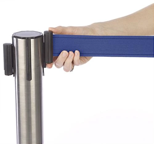 - 2″ high retractable, tightly-woven royal blue nylon belt extends anywhere between 0″ and 9′-7″