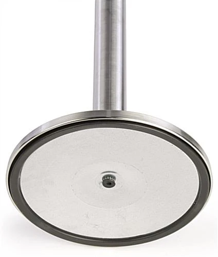 - Heavy-weight, 16 lb. rust-resistant steel base; features brushed stainless steel protective cover (that matches crowd control stanchions’ finish) to prevent scratching & marring of base (21.5 lb. total weight)